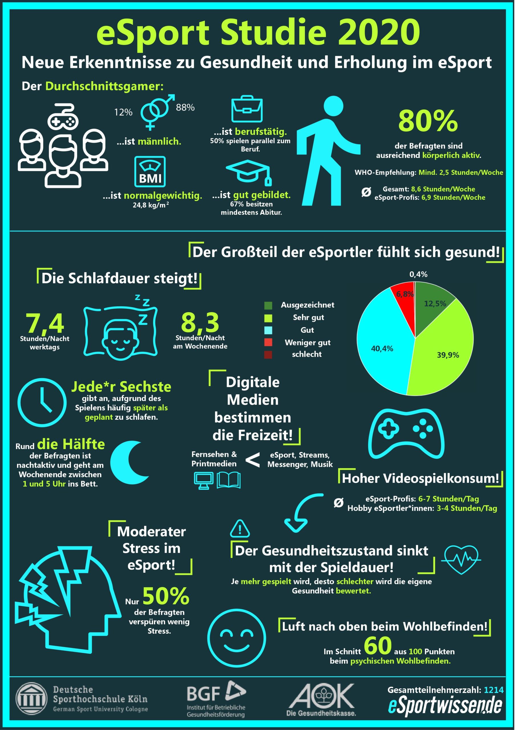 Bereits im vergangenen Jahr konnte mit der ersten eSport Studie 2019 ein umfassendes Bild des Gesundheitsverhaltens im eSport gewonnen werden. Für die diesjährige Befragung der eSport Studie 2020 standen die Themen „Wohlbefinden“ und „Erholung“ im Mittelpunkt, zu denen wir erneut über 1200 eSport-Amateure und Profis befragt haben. Die daraus gewonnenen Erkenntnisse wurden am 12. Februar im Rahmen einer Pressekonferenz vorgestellt.